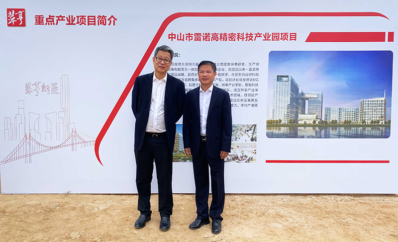 (廣東雷諾精密科技有限公司董事長詹西洲與翠亨新區管理委員會副主任許行合影留念)
