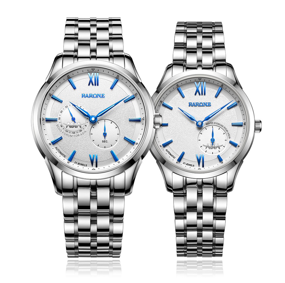 2016年新品以男女對表形式呈現(xiàn),搭載進口全自動機械機芯,透視底蓋清晰可見機芯運作。男女表在設(shè)計細節(jié)上做了區(qū)別,更加匹配男女士對美的不同追求。除了經(jīng)典的黑色,間金色之外,新款首次采用鋼藍色表針和字釘,為商務(wù)用表融入活力元素,同時視覺上更加清爽。大兩針搭配60秒功能小眼顯示時間,為當(dāng)下手表的熱門設(shè)計,男表9時位增加一個24小時功能小盤,方便知曉和調(diào)教多維度時間。表盤上的“ASIA”標(biāo)識體現(xiàn)腕表的身份和紀念價值。