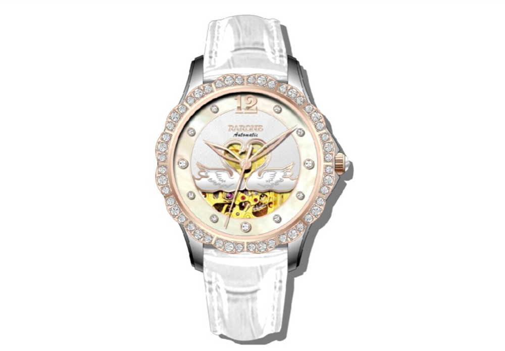 主打知性商務(wù)風(fēng)的夜色系列,在去年推出備受市場(chǎng)歡迎的“天鵝守護(hù)”陶瓷款之后,再度升華“守護(hù)”概念,加入更多代表幸運(yùn)的“水晶”元素,花瓣形表圈鑲嵌48顆不對(duì)稱水晶石,增添腕表的璀璨與時(shí)尚,天然貝母面,使腕表更優(yōu)雅華美。表盤中心兩只天鵝相依成心形,象征忠貞不渝的愛(ài)情和守護(hù),極致唯美浪漫。